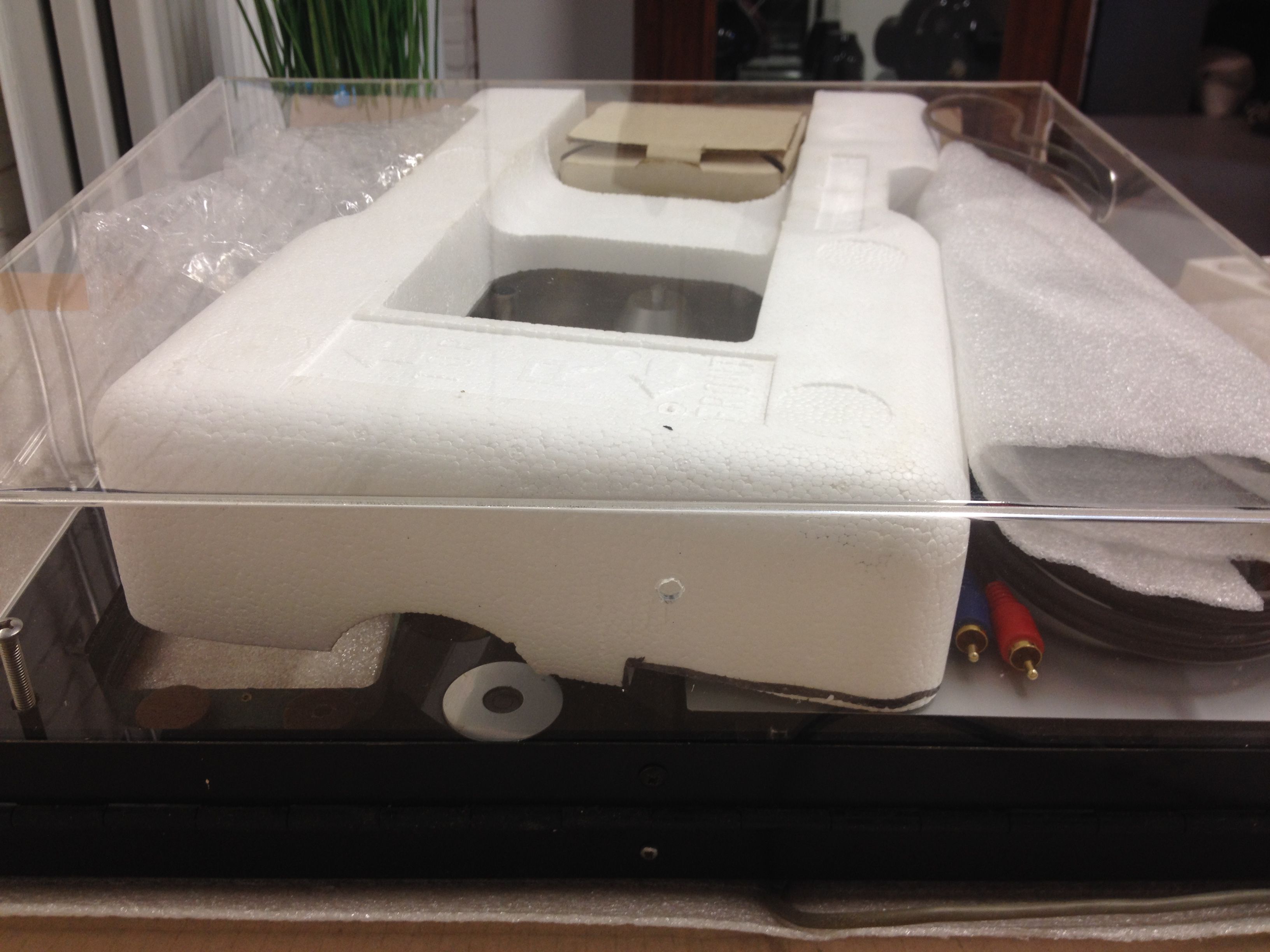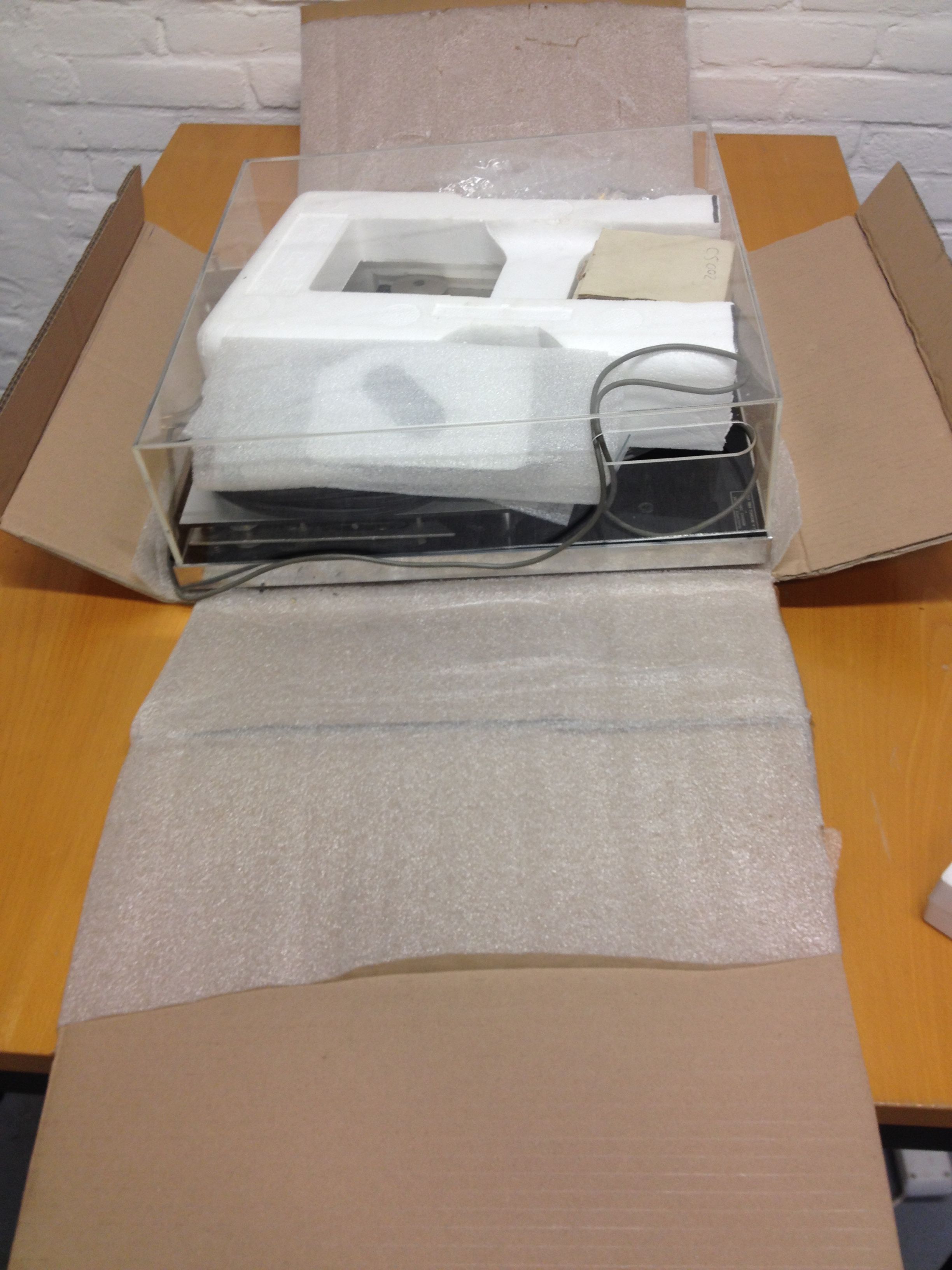 Platter is foam padded on bottom side and polystyrene on top, compressed by the lid, which is in turn tightened by the cartonframe. Arm detached and packed in bubblewrap, shell and cart same, as well as strobe wheel and feet. A tight package but not considering crashes or other unforseen circumstances it ought to work. Only thing that might pose a problem is the small flacon with the viscose liquid- but in the worst case scenario I’d have to discard it and have it sent afterwards by air mail. Mmm, let me correct that, worst case scenario is me winding up in a Spanish gaol because they think it’s nitroglycerine – but that is slightly unlikely.