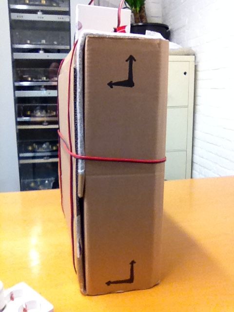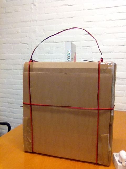 So I cut out a carton rectangle with two flaps on the long side as cover for the sides, which I lined with 0.5 mm foampadding. And came out 43 by 45 by 15 cm, with just the mainbearing protruding about 2 cm at the bottom. Literally and figurally speaking, see if I can squeeze it in. I’m flying a subsidiary of KLM, Transavia, and they are known to be finicky. But a gamble worth taking.